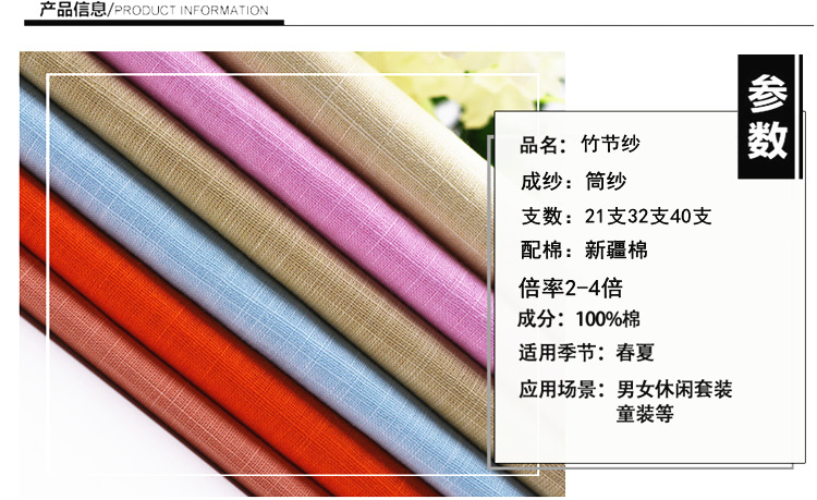 纯棉竹节纱40支 C40S竹节棉纱,竹节纱特征是具有粗细分布不均匀的外观,是花式纱中种类最多的一种,有粗细节状竹节纱、疙瘩状竹节纱、短纤维竹节纱、长丝竹节纱等。潍坊永冠竹节纱的显著特点是:纱线忽细忽粗,有一节叠出的称竹节,而竹节可以是规则分布也可以是不规则分布,分气流纺竹节纱和环锭纺竹节纱。我们公司主要做环锭纺竹节纱